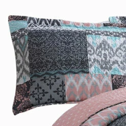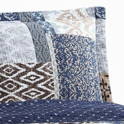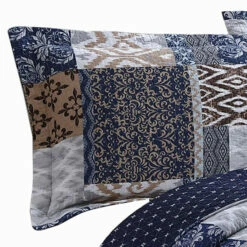Cheapest โ๏ธ Benzara Mai 3 Piece Queen Cotton Quilt Set, Damask, Patchwork, Reversible, Blue ๐
