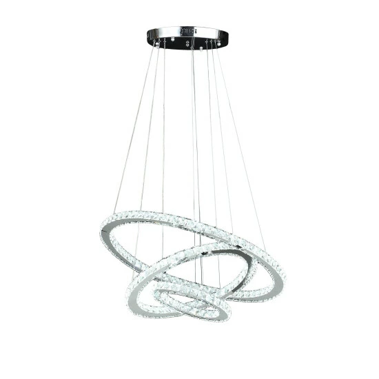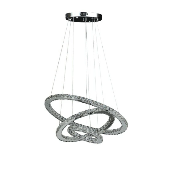 Strikingly attractive and uniquely crafted, this brilliant silver ceiling lamp brings charm to any space in your home. It features glittering clear crystal accents, integrated LED lighting, a remote control, Adjustable height, and a dimmer switch, all adding up to a remarkable sense of convenience. The ringed design brings to mind images of planets, galaxies, and the wonders of the natural world.
