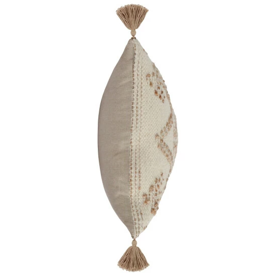 Designed for form fitting comfort, this lumbar accent throw pillow is also piece of pure creativity and eye catching design. The woven diamond pattern in brown shade over an ivory white base is soothing to the eyes and radiates coziness. The tassels attached at the four corners with a hidden zipper gives a clean look to this beautifully crafted piece. Spot clean or dry clean for longevity.