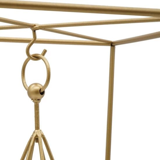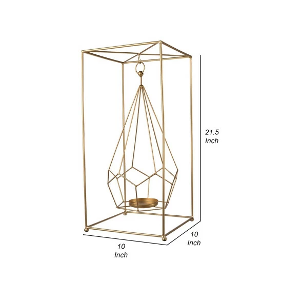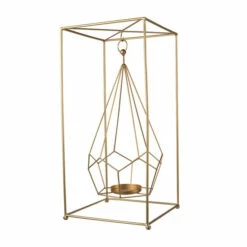 Add a welcoming addition to any living room, foyer, or bedroom with this uniquely made modern style candle holder. Crafted from premium quality iron, this piece is made to last. It features a sleek geometric design and a hanging holder to prominently showcase a tealight candle in serene beauty. Its gleaming gold finish and smooth silhouette instantly brighten any space.