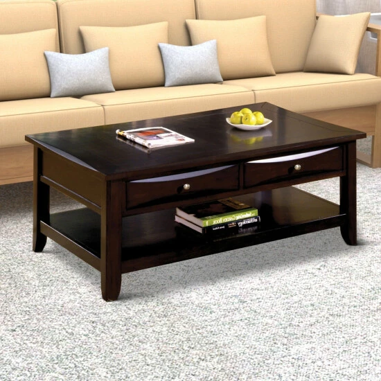 Add appeal to your living area with these contemporary style espresso coffee table. Each drawer has ample storage and a lower open shelf for great storage or display. It is coated in expresso finish and is made from solid wood. A beautiful and classic piece of furniture that is offered by us to add a sense of modern style and traditional settings to your home. Modern Furniture reflects the design philosophy of form following function prevalent in modernism.