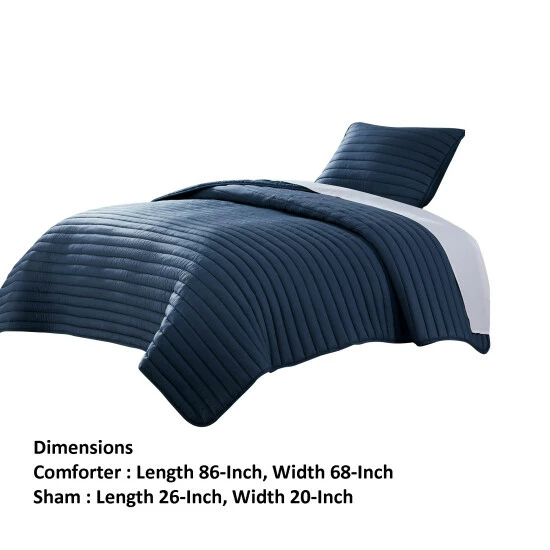 Royal in aesthetic, lightweight, and superbly comfy, this two piece twin size comforter set in navy blue finish is a warm embrace on cold evenings. The subtle yet aesthetically pleasing channel quilted front is made and filled with high quality polyester fabric for enhanced softness, making it a perfect fit in your kids bedroom, dorm, or guest room. Check out our Cabe collection for more options.