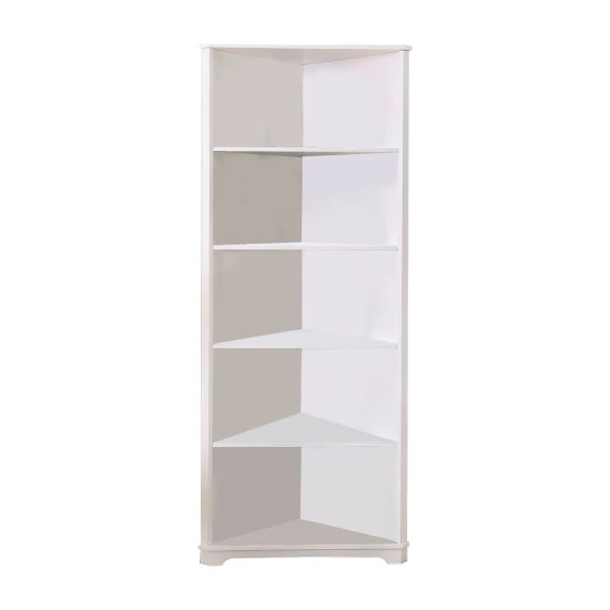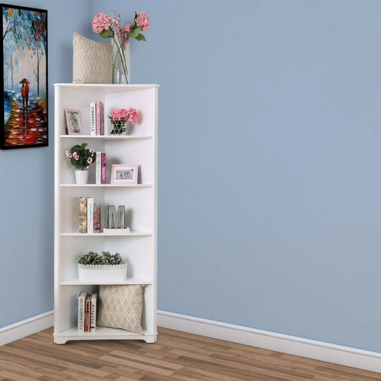 Update hidden corners of your home with this five-tier corner shelf. Made up of solid wood and wood veneer, featuring a white finish, this corner bookshelf has spacious shelves that are perfect for storing or displaying decorative accents. Designed with precision, this functional unit will not only maximize your storage solution but will give a elegant style statement too your decor. With its compact and sleek design, this bookcase will create a serene end cap look your home decor.