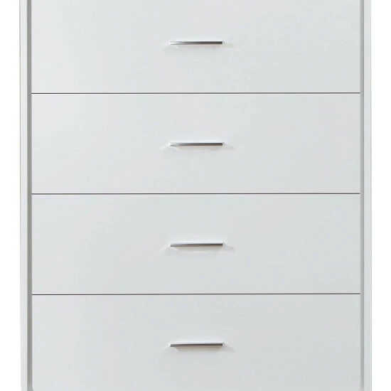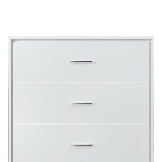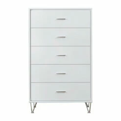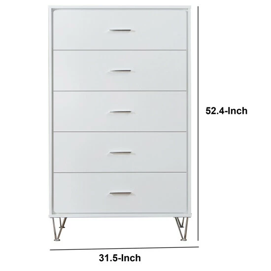Add a touch of sophistication to your home decor with this Chest that seamlessly fuses hallmarks of contemporary and traditional styles. Crafted from engineered wood for durability and finished in a subtle white tone, this chest will effortlessly blend with your existing decor. The chest features five drawers with metal handles, that lets you store all your clothes and other essentials neatly tucked away and keep your room clean. Its unique chrome finish metal legs elevates it off the floor and makes cleaning a breeze. Note: Other featured items in image except this Chest are sold separately.