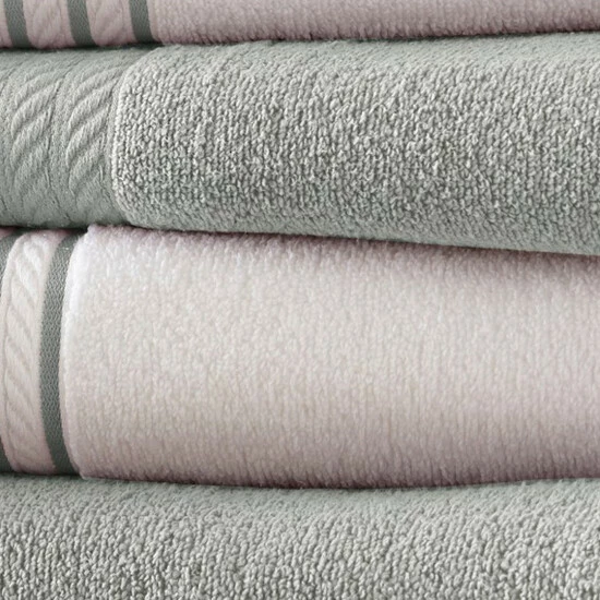 - Set consists of two bath towels, two hand towels, and two wash towels