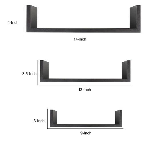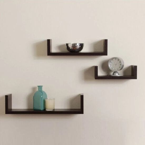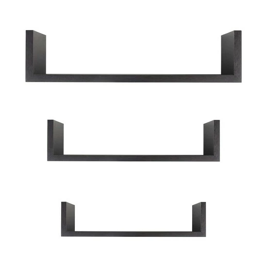 Danya B? set of 3 Nesting “U” Shelves makes space utilization efficient & is perfect for displaying your favorite books, collectibles, photos, toys, awards, CD’s, videos, decorative items and more. They can be hung with the vertical sides either up or down, according to the effect you want to create. With the vertical sides up, it is like having a built in bookend. With its contemporary espresso finish, they are the ideal accent for any living space. Easy to install with no visible connectors or hanging hardware. All hardware included. Overall measures: Large: 17 x 4 x 4″. Medium: 13 x 4 x 3.5″. Small: 9 x 4 x 3″. Danya B? is a registered trademark of Danya B Inc.