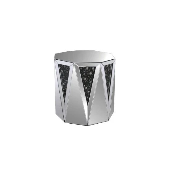 This octagonal end table has mirrored top, wood frame and black crystal accents. Features triangular sides with acrylic inserts, this octagonal end table is lined in beveled mirrors that catch the light and reflect your bold design aesthetic. Dark acrylic triangular inserts are studded with crystals for visual drama. It has mirror finish.