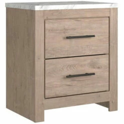 This modern rustic nightstand brings farmhouse style into any modern living space. Built of composite wood and laminate, it consists of two spacious drawers that are perfect for keeping books and more neatly organized while its replicated Calcutta marble top in smooth white finish with a classy gray body adds timelessness to any interior decor style. Check out our Finley collection for more.