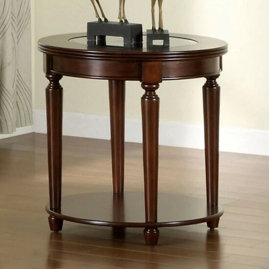 With gentle styling this end table will be a sophisticated accent to the rest of your living room. Finished in dark cherry this table has a beveled glass top and attractive turned legs. The open bottom shelves bring convenience for storage or display. When it comes to decorating your living room, nothing helps accent your room better than a well-chosen end table. This table offer a great place to put decorations and plants, and you can even use it as a place to put your TV remote or favorite book. This furniture piece will definitely make a addition of elegance and style in your decor .
