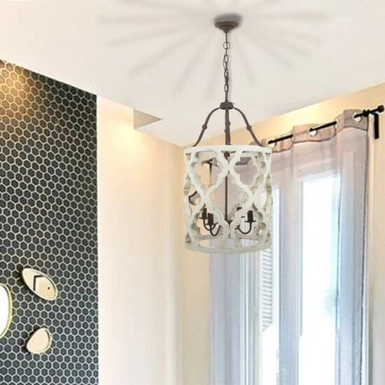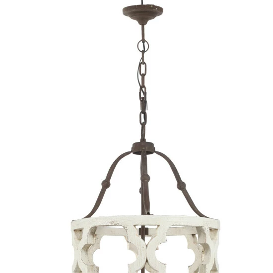 This stunning distressed white wood chandelier will be the perfect addition to your entryway, dining room, or eat-in kitchen. It will add a dramatic rustic and chic element to your decor, perfect for tall ceilings. This?Jolette 4-Light Chandelier features a hand carved wood frame in traditional French country motif and a dark brown metal accents. Place the fixture in your entryway or over the dining table for the most effect.
