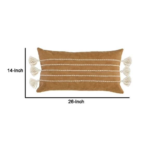 Bring wonderful coziness to your living room or bedroom with this plush lumbar throw pillow. With a soft light brown vegan faux leather front and cotton backing, it is filled with a premium feather and down insert. Showcasing a dashed stripe pattern with playful tassels, this pillow gives a tastefully classy look to any interior home decor. Check out our Karen collection for more matching pieces.