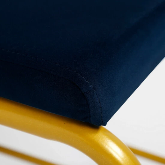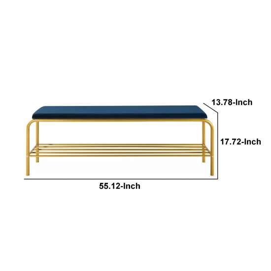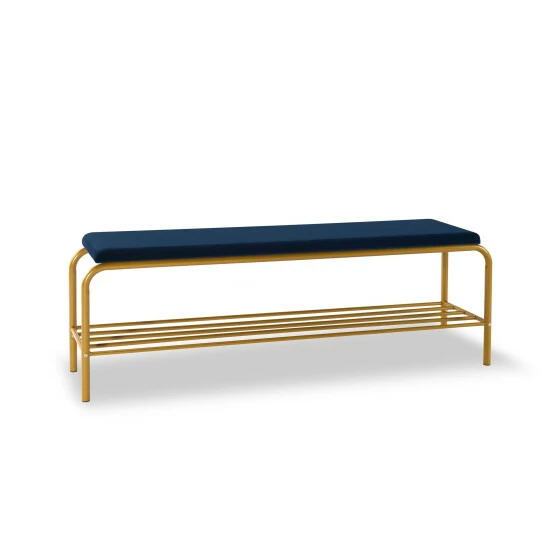 Put up your feet after a long day for a moment of relaxation, comfort, and respite with our shoe rack foyer bench. The blue velvet padded seat provides enhanced softness, and bench doubles as an entryway footstool with a gold metal frame. It has a slatted design, a shoe rack shelf, and an elegantly inviting atmosphere in every way. Check out our Kipp collection for more color options.