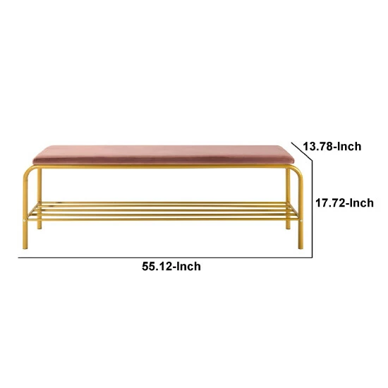 Put your feet up after a long day for a relaxing, comfortable moment of respite with our shoe rack foyer bench. The pink velvet padded seat provides enhanced softness, and bench doubles as an entryway footstool with a gold metal frame. It has a slatted design, a shoe rack shelf, and an elegantly inviting atmosphere in every way. Check out our Kipp collection for more color options.