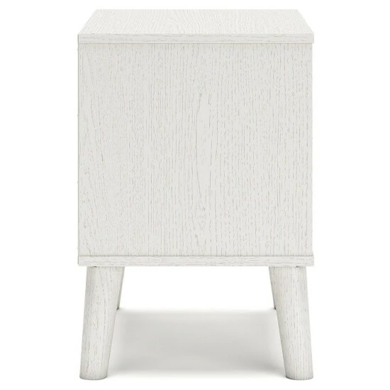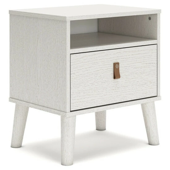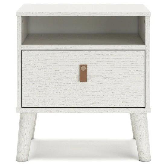 Finished in a brilliant crisp white tone, this gorgeous nightstand exudes luxury and a subtle, understated flair of modernity to any bedside. It features a spacious countertop, a smooth gliding drawer with a faux leather knob, one open compartment to store your nighttime essentials conveniently close at hand, and it is sure to be a striking and confident accent to your bedroom or guest room.