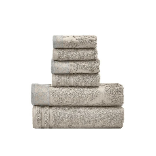 Indulge in luxurious daily self care with this six piece 100 percent cotton towel set in medium gray. This set of two hand, two bath, and two wash towels has enhanced absorbency and they are surprisingly durable. They have a solid tone finish with damask pattern accents for a sense of pure elegance in your bath set. For the perfect look, check out more color options from our Noa collection.