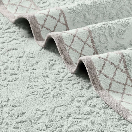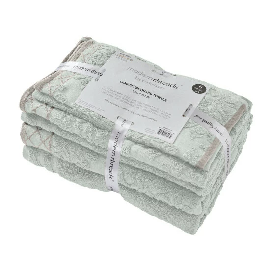 - Set consists of two bath towels, two hand towels, and two wash towels