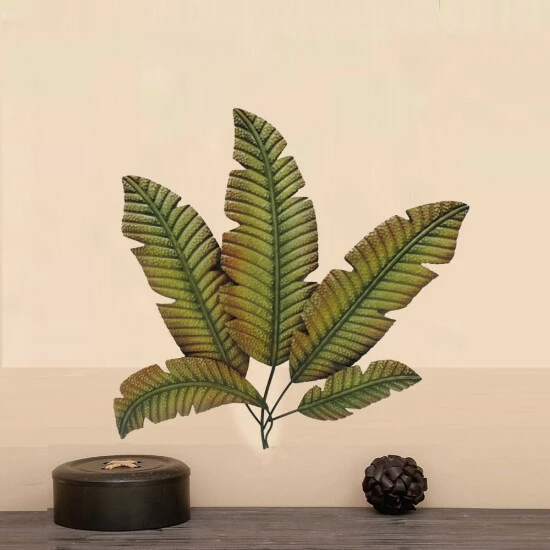 Bring exotic vibe to your abode with this palm tree leaves Wall Decor. It is made up of metal and features natural lime green and brown finish. It reflects the silhouette of a ย tree branch with five leaves with real like aesthetics. One can accommodate this wall decor to their home or office interiors for a simple yet effective update to the existing appearance. It can even be used in spa centers, yoga rooms, or meditating rooms, creating natural aura all around. Lightweight iron construction with hardware in the back makes this easy and ready to hang in your entryway or as a living room centerpiece for a tropical vibe.