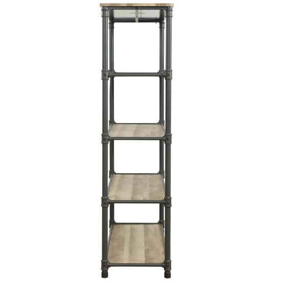 - Constructed sturdily from wood and metal and is accented in the hues of gray and black.