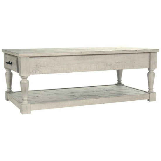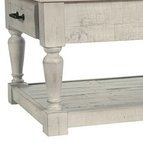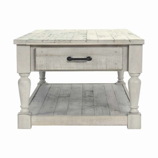 Your quest to find a perfect centerpiece for your living room ends with this farmhouse style Cocktail Table. Distressed whitewash finish is complemented with plank style construction and knots, while the open bottom shelf offers additional display and storage options.