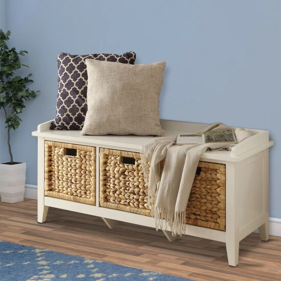 Keep your entryway fresh and organized with this lovely wooden storage bench, featuring three spacious brown rattan baskets like drawers. The low-profile design, and crisp finish make for charming windowsill seating. This bench is also perfectly suited to update the bathroom, dressing area, or living room. From small spaces to wide and roomy, ample interior storage keeps messes tucked away.