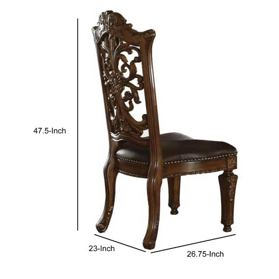 Bring home a voguish and comfortable seating option all in one. This set of two side chairs is upholstered in brown faux leather and bears a wooden framework. This set incorporates tapered legs and cut-out floral carvings on its back accompanied with a nail head trim on the seat for added visual interest. The chairs feature a padded seat and back for the utmost comfort and a button tufted back. The wooden and polyresin construction gives this stunning set of side chairs the edge of strength, immense resistance and a robust structure.