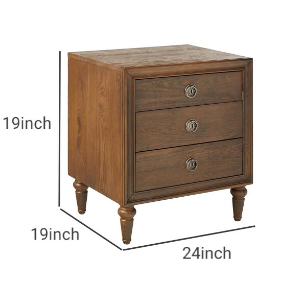 Instill a rustic feel into your bedroom with this reclaimed oak Inverness nightstand. Three roomy drawers give you space to stow books, personal items, and more, while the spacious top provides ample room for a lamp and bedtime essentials. 3-drawer nightstand Includes metal handles. this traditional style nightstand made of wood with brown finish and supported by tapered legs.