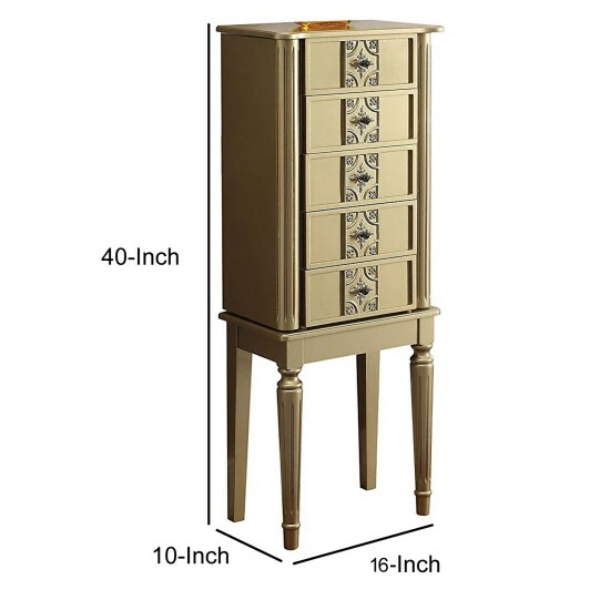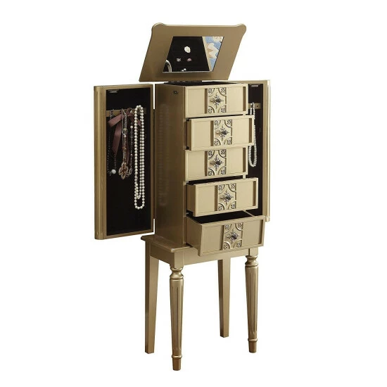 This stylish jewelry armoire is great for ladies that love their jewelry displayed in a classy way. It features sturdy wood construction in gold finish, raised mirror, five jewelry storage drawers and two side doors with hooks. Each storage compartment is nicely lined. Nicely crafted drawer fronts with the wooden fluted legs, the jewelry armoire will be a functional and stylish addition to any bedroom.