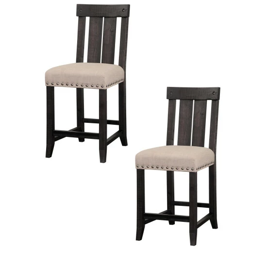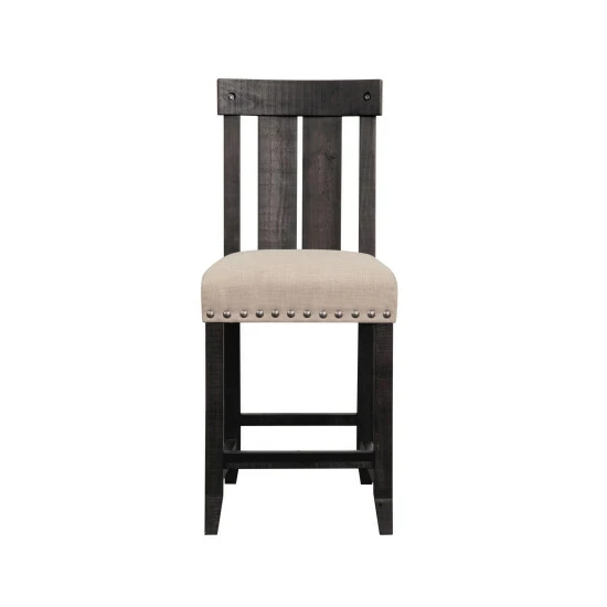 Add an industrial look to your dining space with this Counter Height Stool. Crafted from solid wood in a distressed black finish, this stool features an ergonomically curved vertical slat back and a fabric upholstered cushiTwod seat to keep you and your guests comfortable during your dinner parties or game nights. The stool is completed with exposed hardware and nail head trim that makes it an ideal option for any industrial or rustic inspired dining room, kitchen or living room.