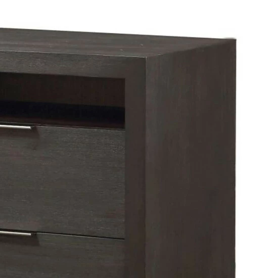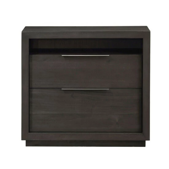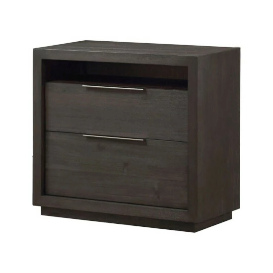 Keep your bedtime essentials nearby with this wooden nightstand by Benzara. The dark grey finish enhances the clean lines and sleek nickel-plated drawer pulls to deliver modern charm. Made with acacia wood for added sophistication, this nightstand features two large drawers to store extra bedding or nightwear. One open cubby compartment works well to store your personal items, reading materials, or tablet. The square top easily holds your table lamp or alarm clock, and the soft-close drawer design offers added convenience and functionality.