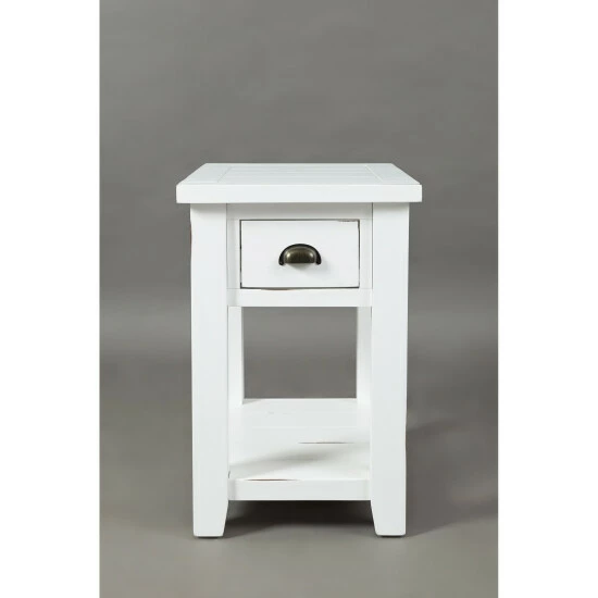 This chairside table is a useful yet beautiful addition for home. Made up od wood and metal fitting, this incredibly designed weathered white finish table has one drawer and one open shelf at bottom for easy storage. The drawer features an antique hardware cut-out handle for easy pull that makes it a real treasure. Place a table lamp or other decorative on table top surface to decorate your furniture setting easily. This visual delight cabinet is a must bring furniture for home. Drawer Dimensions: 6.25″W x 13.25″D x 3″H. Shelf Dimensions: 13.5″W x 21.25″D x 11.75″H.