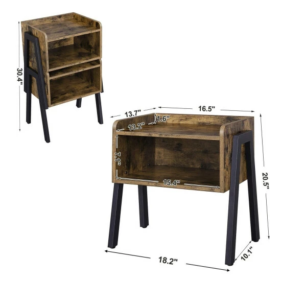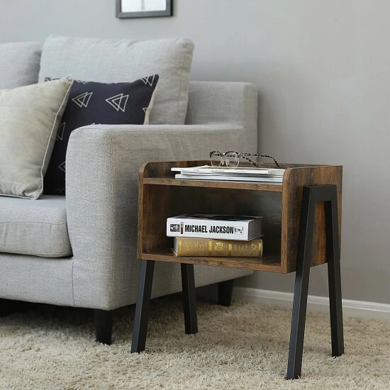 Bring farmhouse flair to your living space with the inclusion of this end table. It is constructed from durable P2 compliant chipboard is supported by flared iron legs in powder coated black finish that provides a great contrast to the rustic brown finish top. It features an open storage compartment that provides a plenty space for the storage of books and other materials while the raised edges at a top protects the things from falling off. This end table is uniquely stackable, where you can add an another one on the top to use it as a chest or bookshelf.