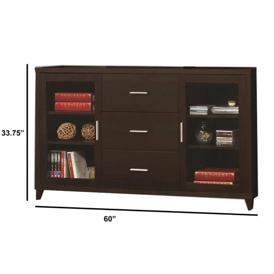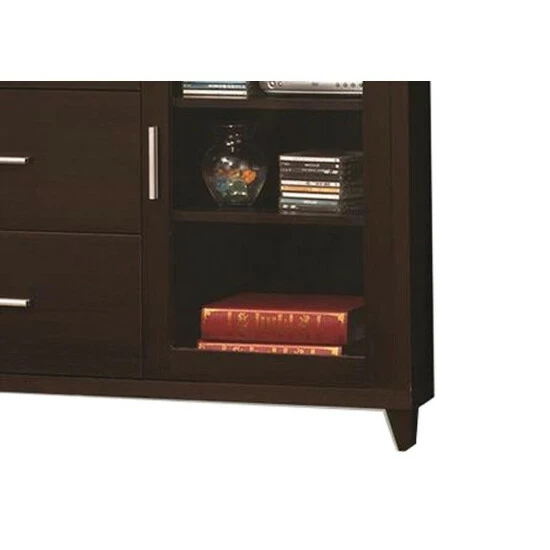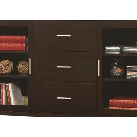 Bring this TV console to create a perfect place for television set. It has wooden constructed framework with cappuccino brown finish. It features a two cabinets with glass panel door and metal bar handle each, three spacious drawers providing ample storage space for keeping all the entertainment, media components, CDs, DVDs at one place. Place this against a wall or corner area in your living room or bedroom.