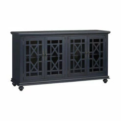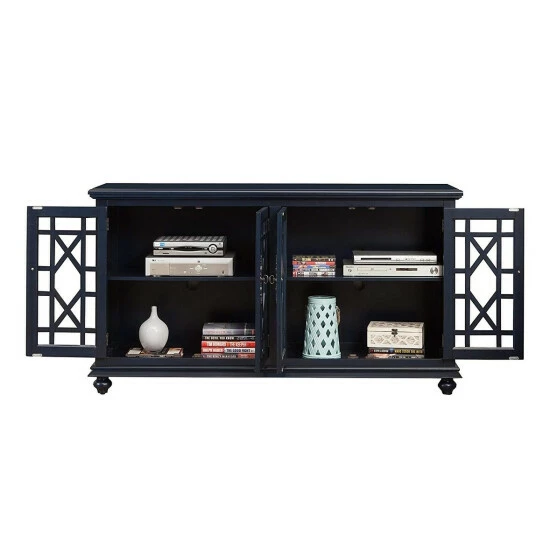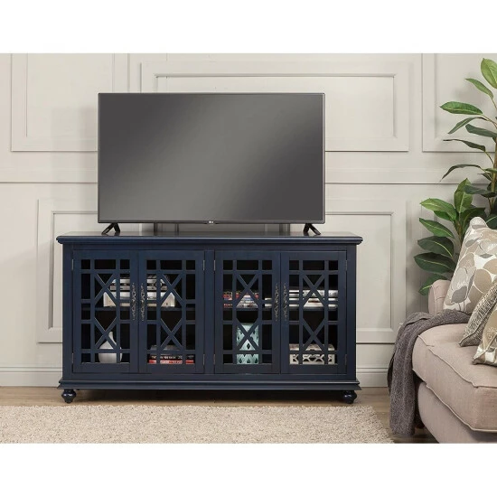 This TV stand will take your entertainment to another level and lead your setting in a rousing style. Constructed with MDF and pine, the Catalina blue finished stand displays elegant trellis details on the doors along with bun feet and intricate door pulls to enhance the look. It is ideal for 65 inch flat panel TV?s