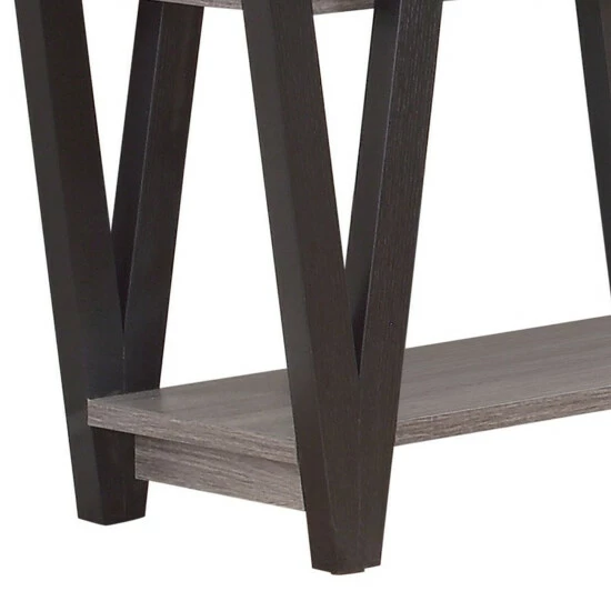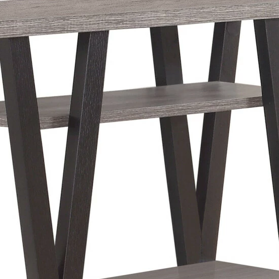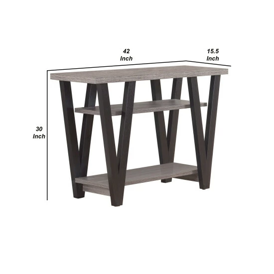 Lend your living area a retro look with this modish sofa table. Its rustic weathered gray finish lends antique mid-century charm to your interiors. Featuring an antique gray and black finish and an exceptional ‘V’ patterned zig-zag base, this sofa table is the perfect addition for any living room to create slight transformation with visual appeal. It also renders two open bottom shelves for additional display or storage.