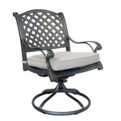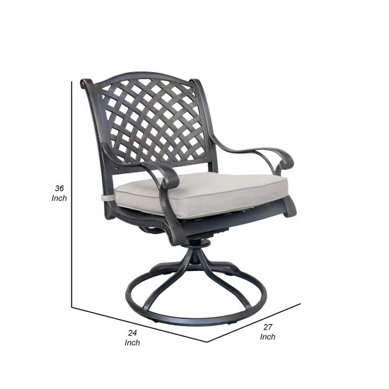The charming and traditional meets the rugged and industrial with this gorgeous swivel arm chair, crafted from cast aluminum with a rust and weather resistant finish and powder coating that protects it from rust, scratches, and UV rays. Rolled armrests and scrolled legs ensure a stable, comfortable seat with a stylish, relaxed design. Check out our Zoe collection for matching items.